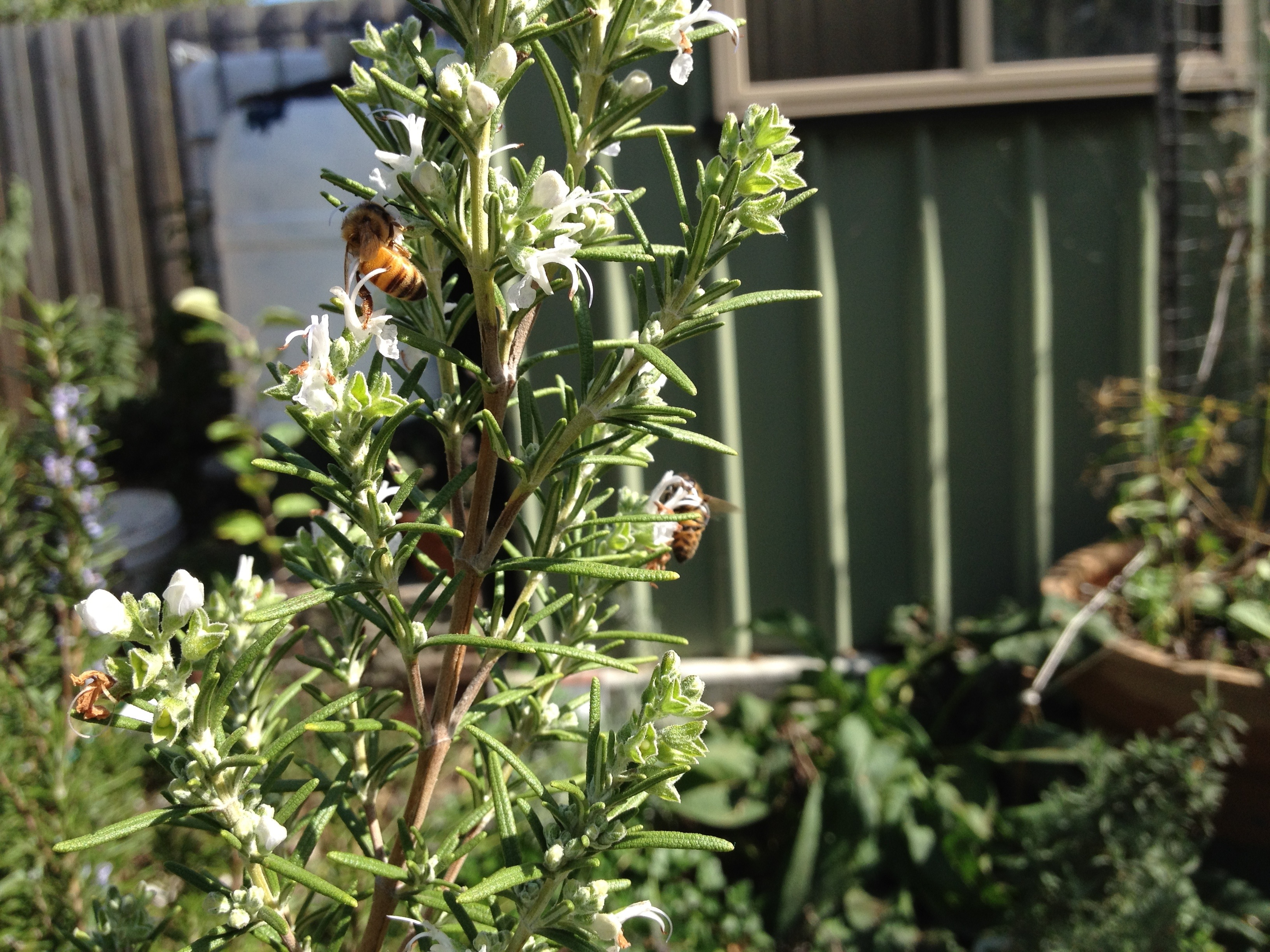 The white rosemary flowers will last through the Winter, and attract any bees that happen to be foraging at that time. Help a bee – it helps us all.