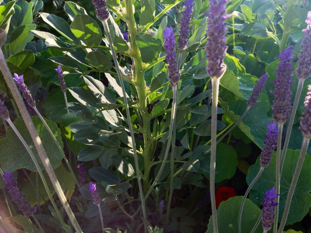 Broad bean pods replacing white with black stained flowers, surrounded by lavender and nasturtium, in the morning shadow of a lemon tree.